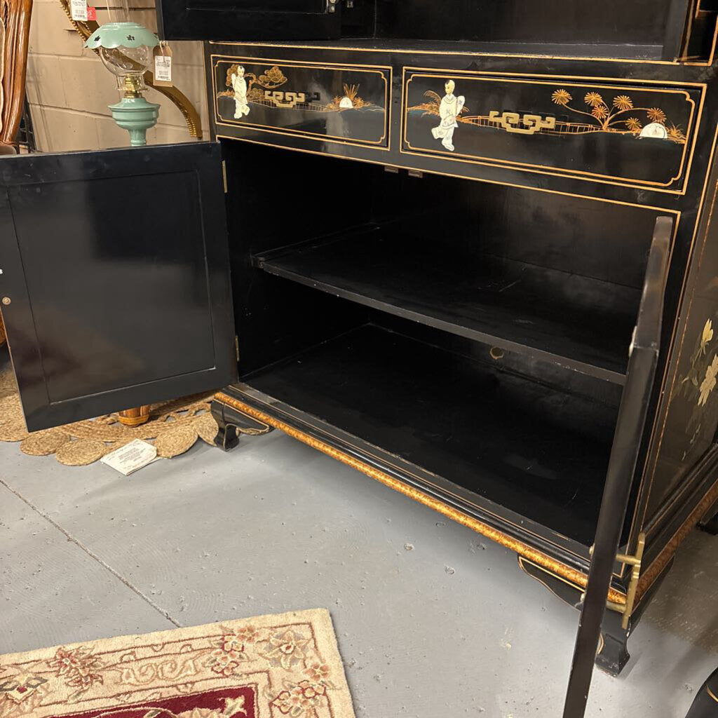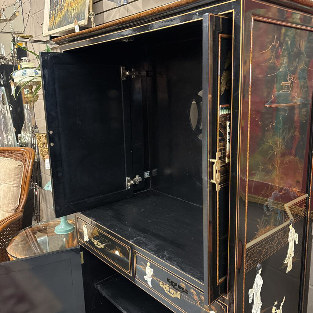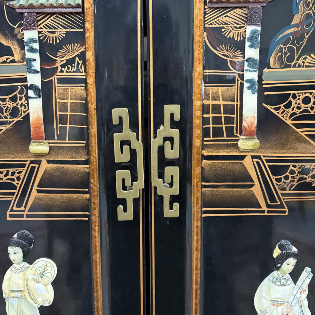Black Lacquer Chinoiserie Pocket Door Cabinet w 3 Dimensional Mother-of-Pearl Accents