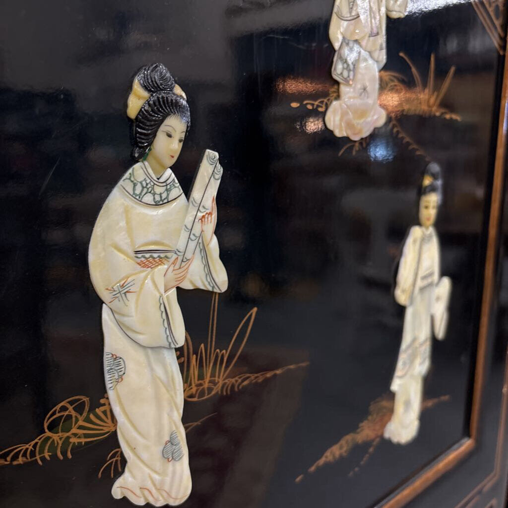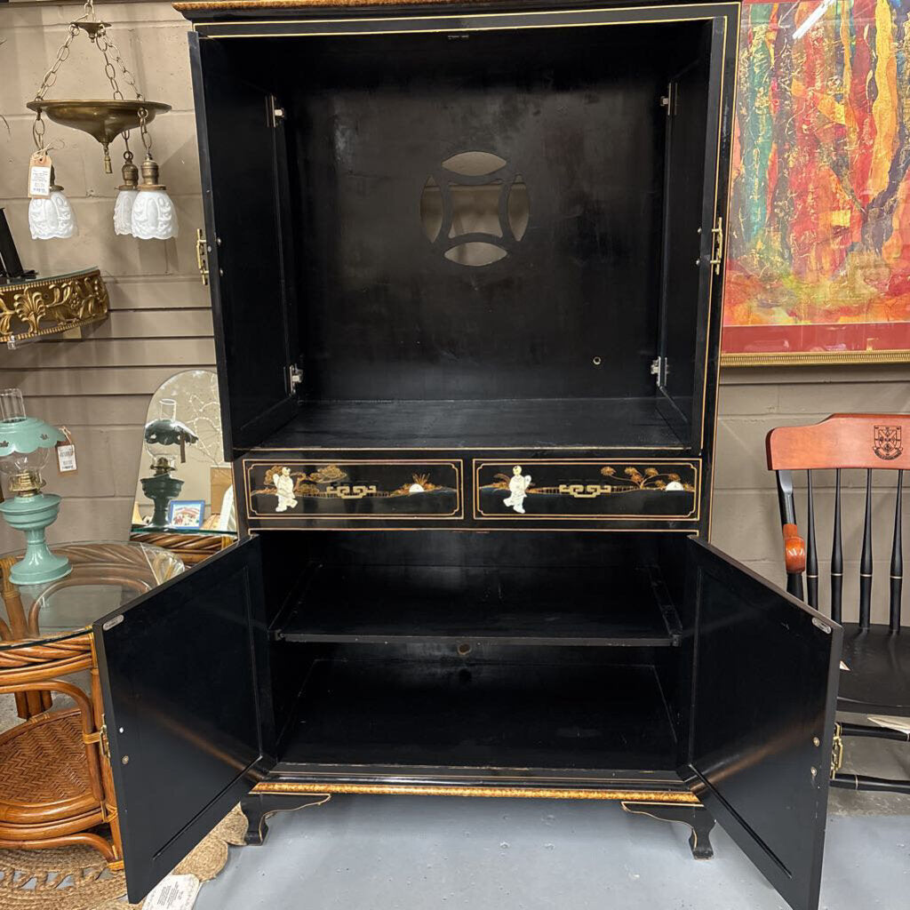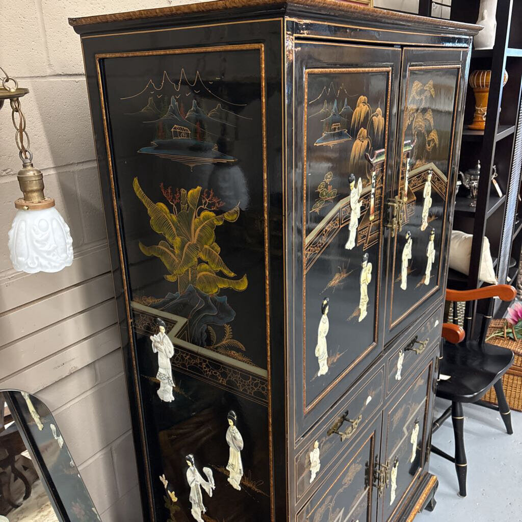 Black Lacquer Chinoiserie Pocket Door Cabinet w 3 Dimensional Mother-of-Pearl Accents