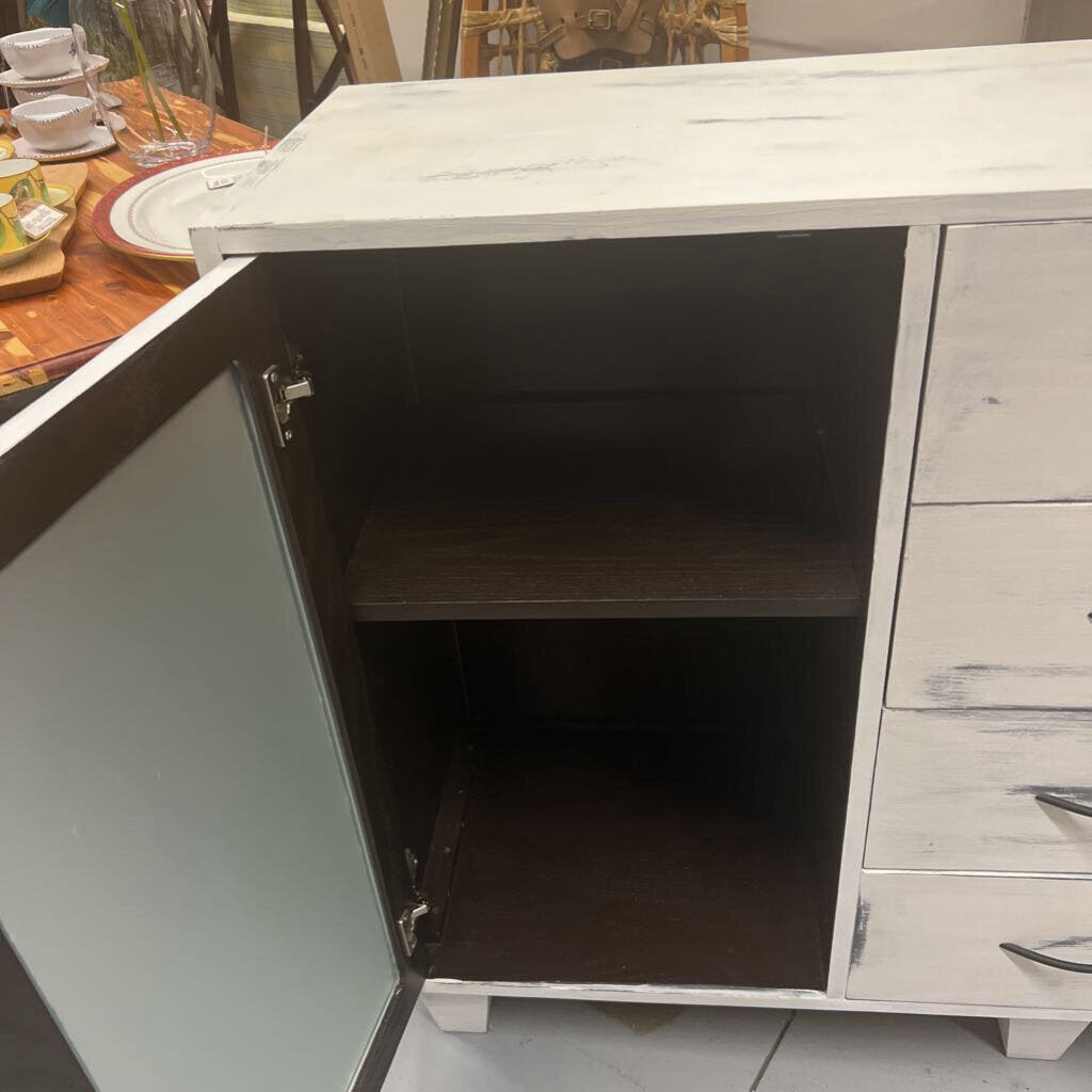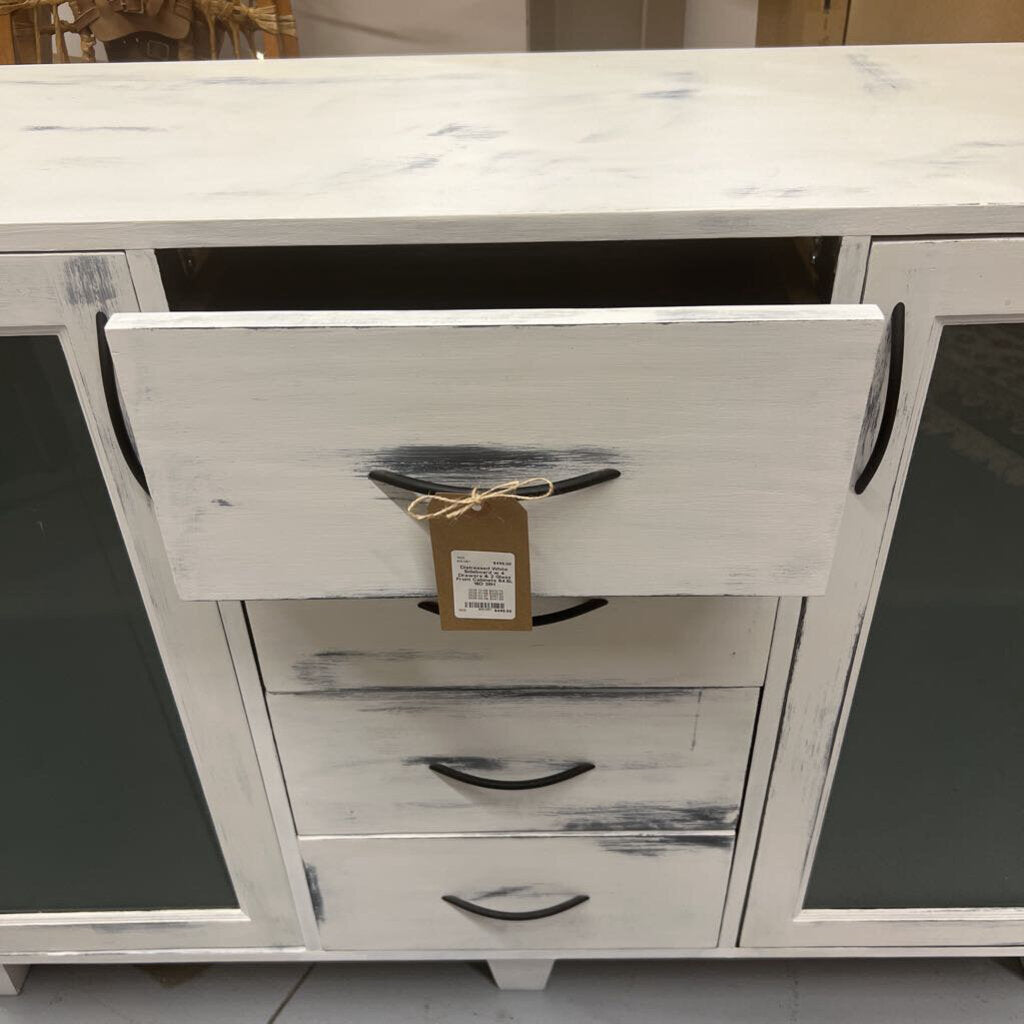 Distressed White Sideboard w 4 Drawers & 2 Glass Front Cabinets