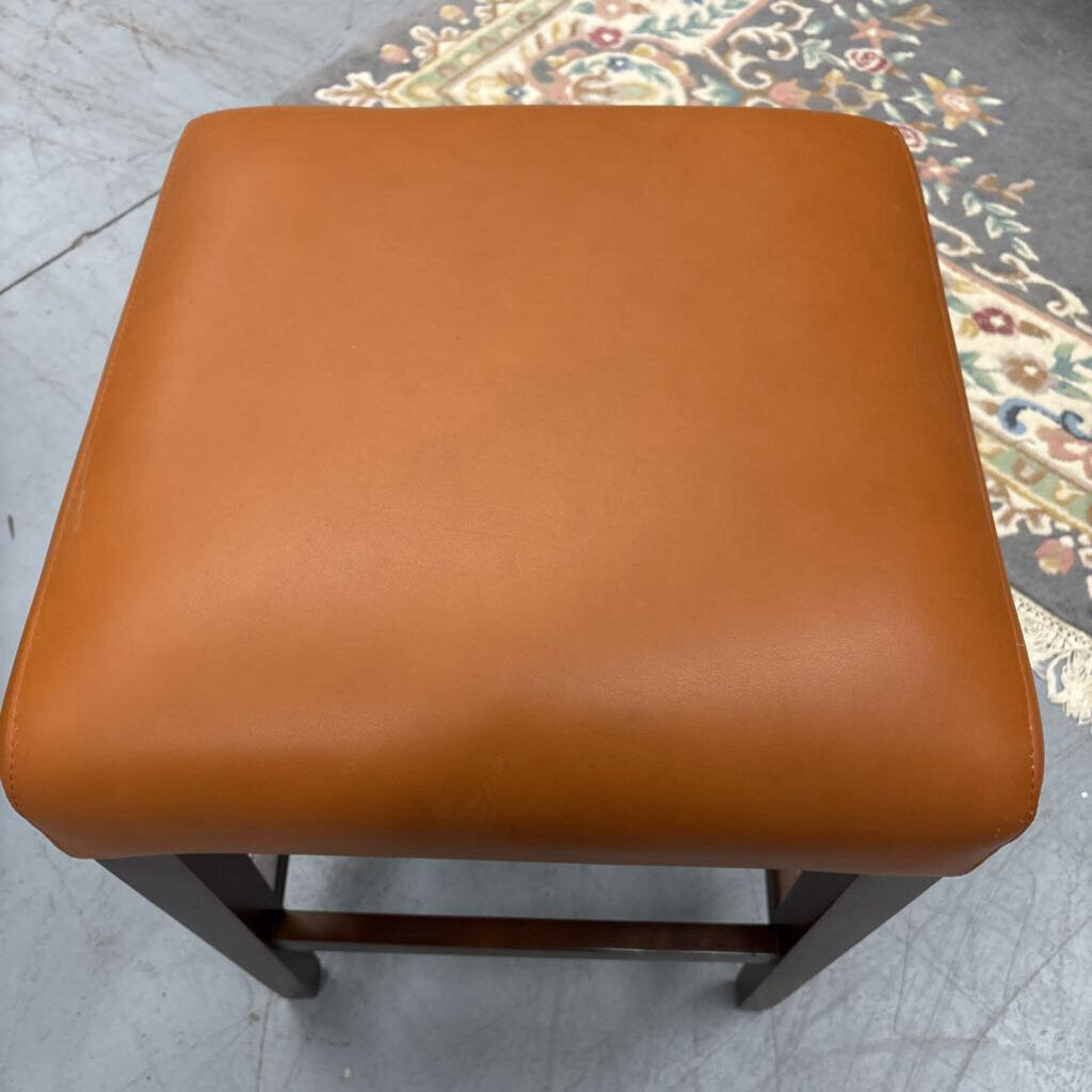 Backless Wood Stool w Burnt Orange Leather Seat