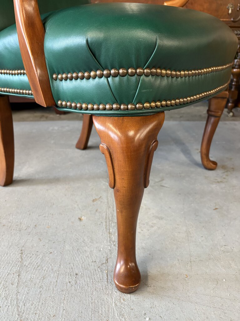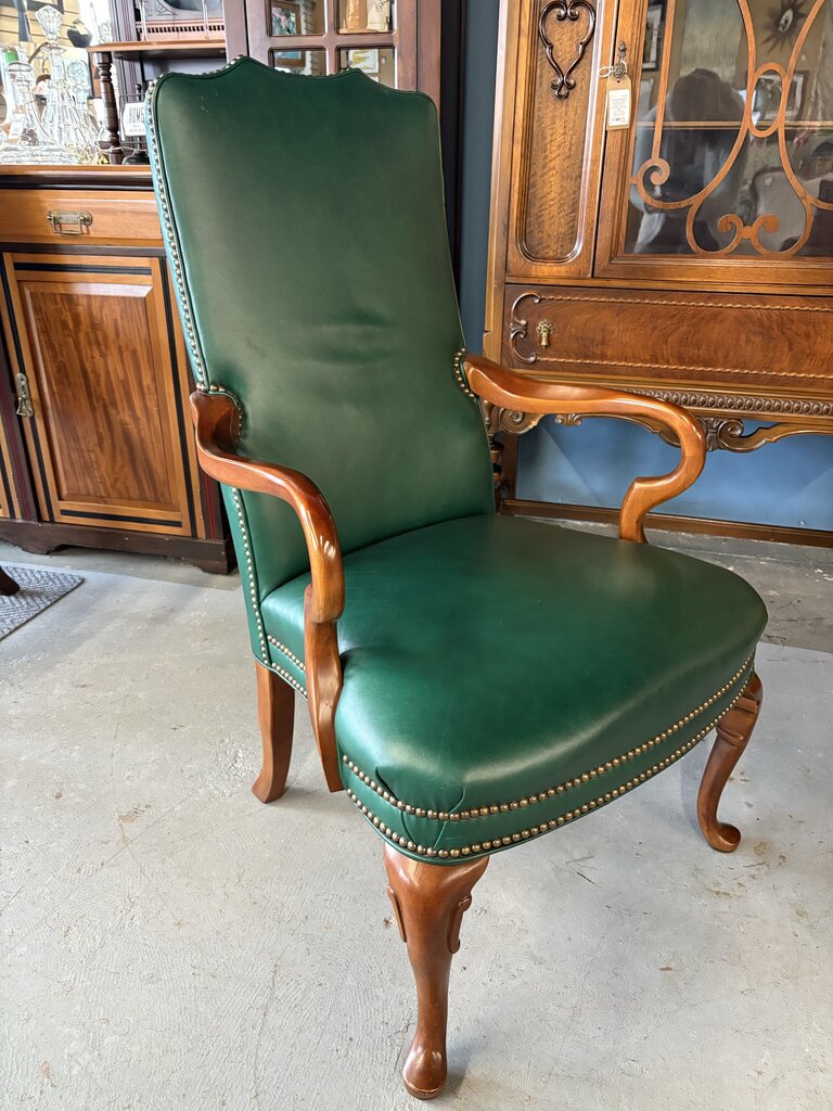 Queen Anne Mahogany & Green Leather Arm Chair w Nail Trim