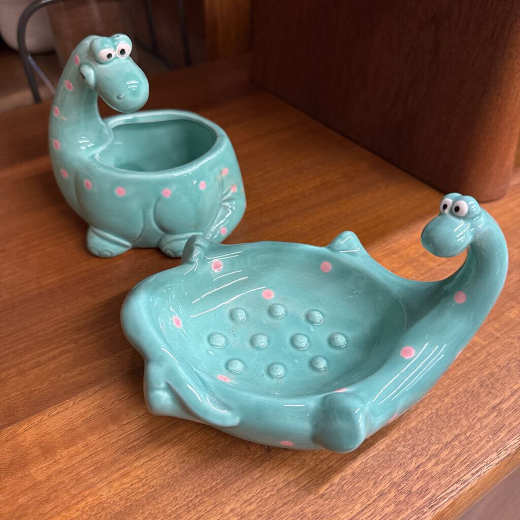2 Pce. Bathroom Set - Green Dinosaur - Soap Dish & Brush Caddy