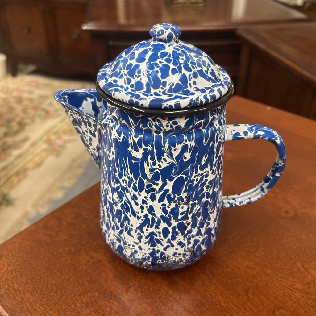White/ Blue Tin Coffee Pot w Lid
