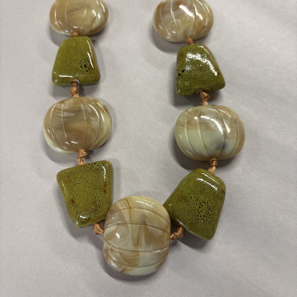 Handmade Chunky Necklace w Green & Beige Large Beads