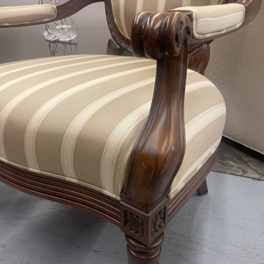 Louis XV French Country Walnut Claw Arm Chair w Cream Striped Satin Seat